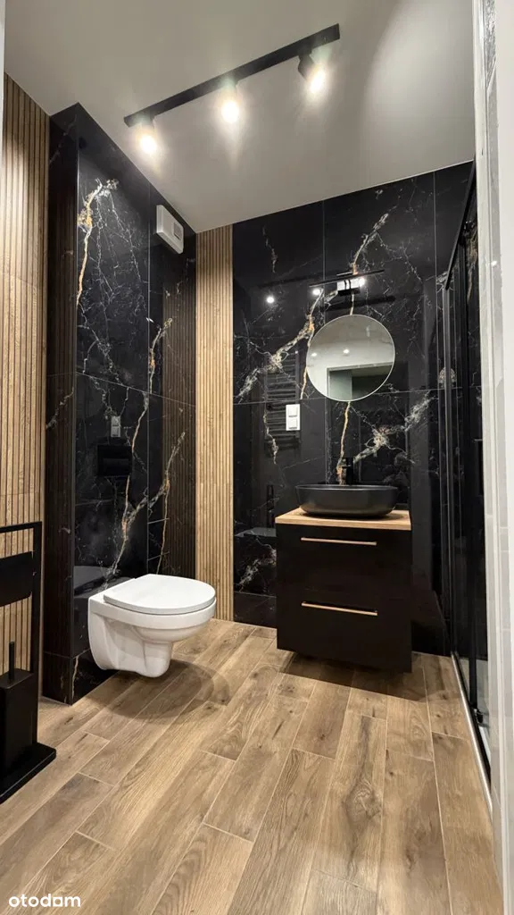 Głównym akcentem są elementy ciepłego drewna oraz betonu dekoracyjnego. Brak gazu w mieszkaniu – ogrzewanie, woda zimna i ciepła – miejskie.