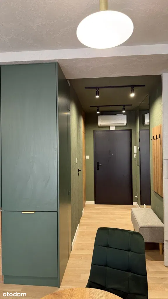 Głównym akcentem są elementy ciepłego drewna oraz betonu dekoracyjnego. Brak gazu w mieszkaniu – ogrzewanie, woda zimna i ciepła – miejskie.